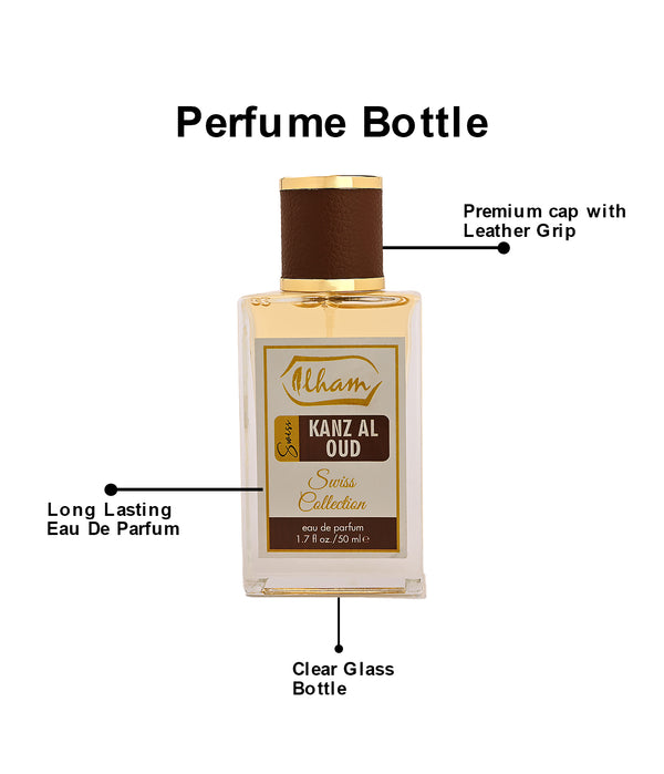 Ilham Swiss Kanz Al Oud Perfume (50 ml) – a long lasting and floral woody fragrance. A lovely merger of top notes of Saffron, Rose, Aldehydes, followed by heart notes of Agarwood (Oud), Woody Notes, Sugar and base notes of Dry Amber and Musk. Try it, its a fresh, uplifting and divine fragrance, indeed much more than just a Perfume.