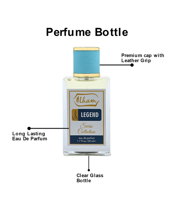 Ilham Swiss Legend Perfume (50 ml ) – is a woody aromatic, elegant and classy fragrance for men. This legendary perfume reflects the confident, captivating and ambitious persona of today's man. Blended with the extraordinary accords of Grapefruit, Marine notes followed by heart notes of Bay Leaf, Geranium and Spices. Base notes are Dry Amber and Guaiac wood. This scent energize your successful day with a refreshing feel.
