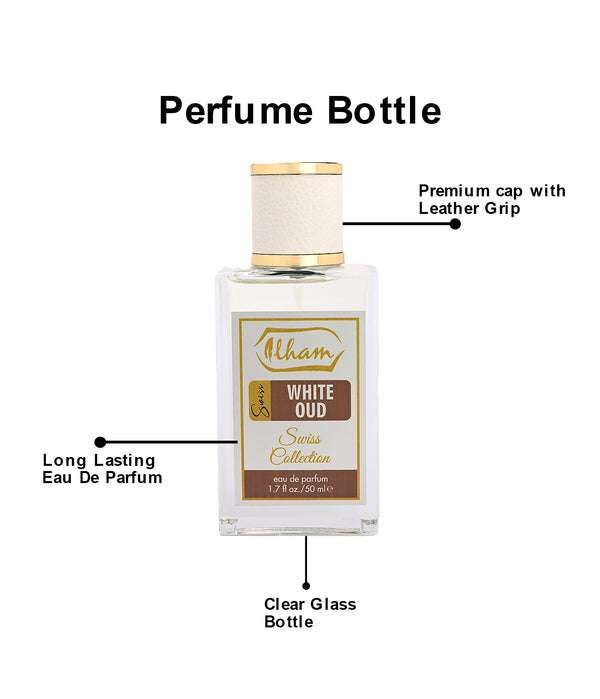 Ilham Swiss White Oud Perfume (50 ml) - a Long Lasting Oud fragrance for men & women. Captivating blend of Lemon and Orange followed by heart notes of Lonone, Violet, Cashmeran and base notes of Patchouli, Amber Musk, Woody and Oriental notes. Indeed a fragrance full of elegance, warmth and grace.